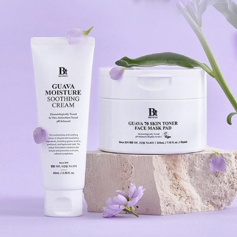 Benton's Guava Moisture Soothing Cream contains guava extracts cultivated in the pristine region of Jeju Island, South Korea. It excels in soothing and moisturizing the skin, helping to maintain the skin's oil-water balance, manage flaky dead skin cells, and leave the skin smooth and soft.