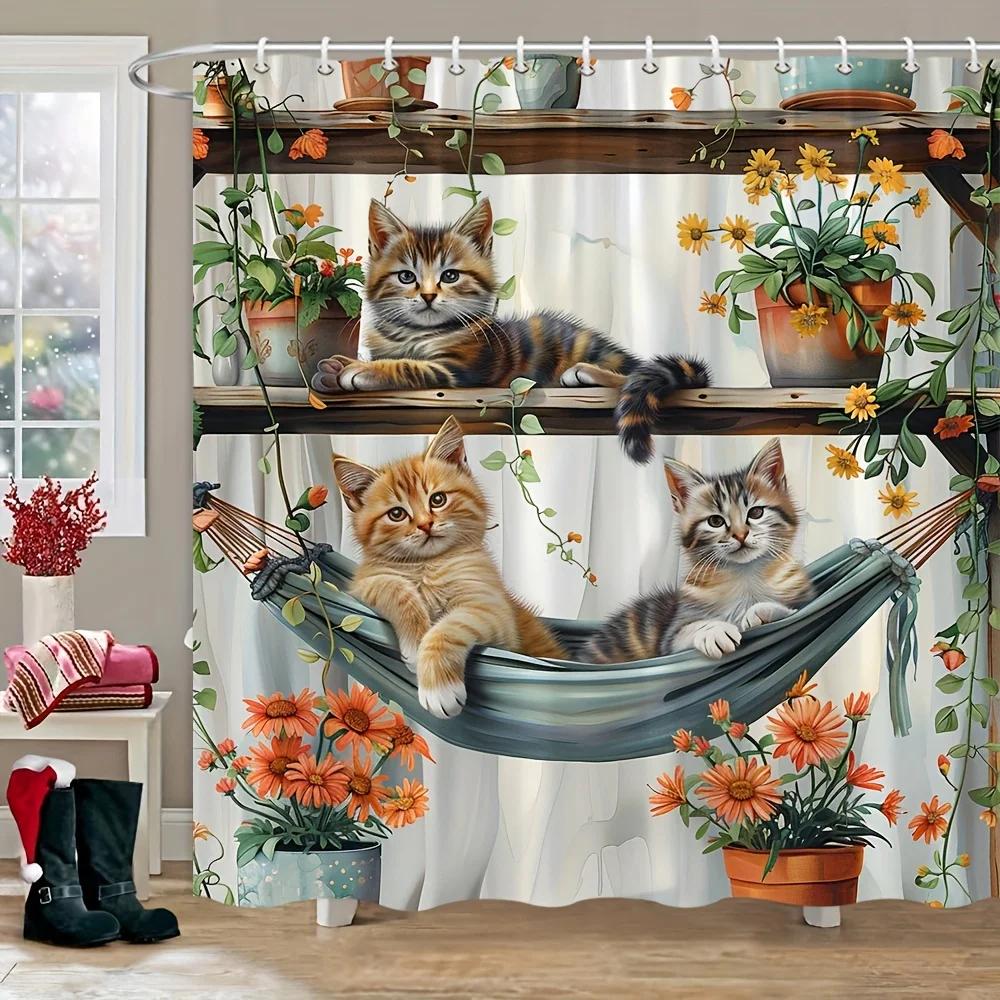 Kitten's Leisure Time series shower curtain, with flower waterproof shower curtain, adds a cute and whimsical feeling
