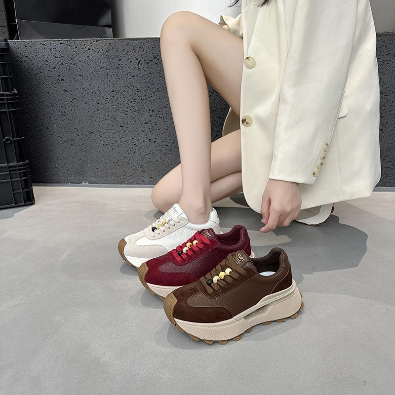 Autumn new leather round head thick sole heightening versatile sports shoes women's light casual shoes