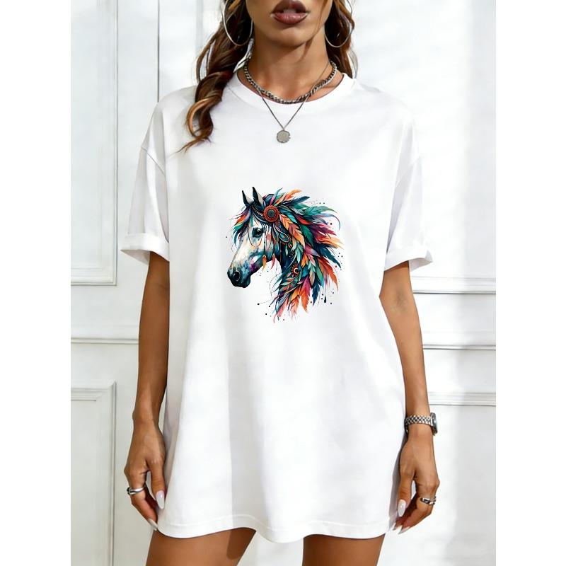 Oversized T Shirt Dress Black Colorful Horse Print Casual Streetwear Fashion Statement Piece For Women Daily Wear Outing And Shopping