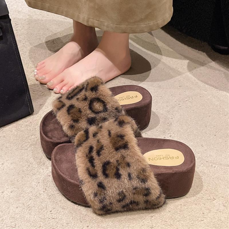 Fashion Women Platform Fur Slippers Leopard Flats Shoes Trend New Slingback Sandals 2025 Summer Open Toe Woman Flip Flops Casual Slides