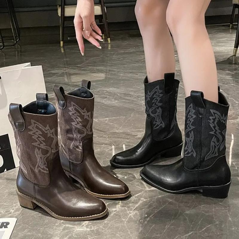 Fashion Retro Pointed Toe Fashion Large Size PU Western Cowboy Boots Shoes for Women 2025 New Zip High Quality Mid Length Women's Boots