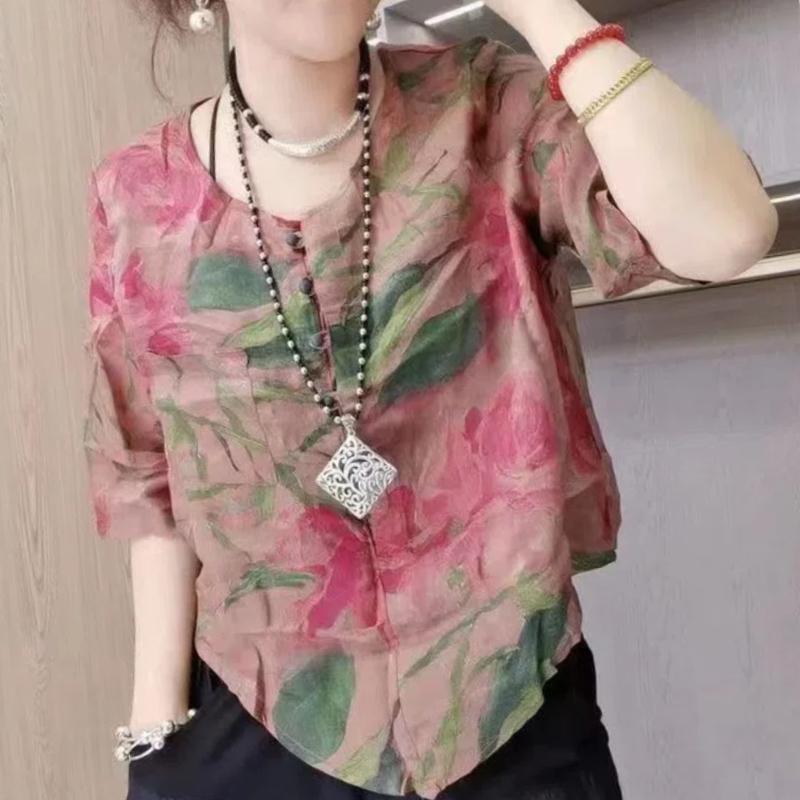 All match floral printing and dyeing artistic short sleeved shirt, popular in summer, casual, fashionable and comfortable top