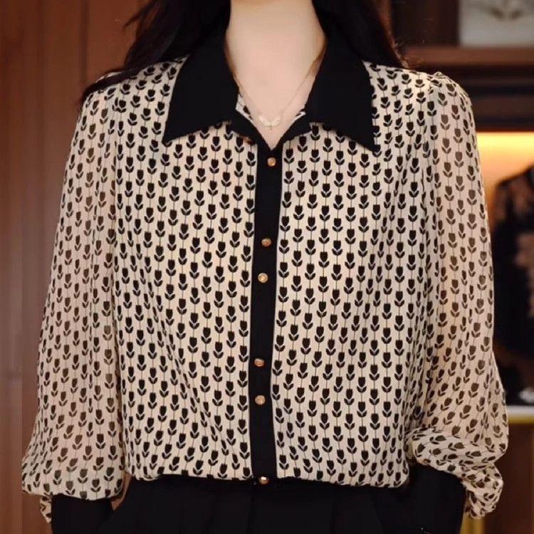 Cămașă cu rever temperamentală, florală, nouă modă de primăvară, cămașă versatilă cu mânecă lungă, patchwork, pentru femei, pentru a reduce vârsta și a arăta mai slab