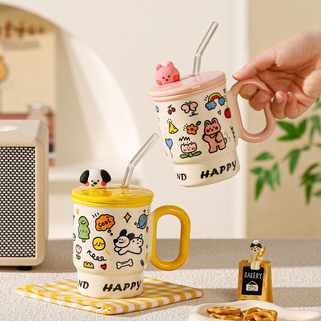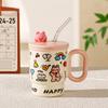Straw mug with lid High value cute animal ceramic cup Household water cup Couple coffee juice cup