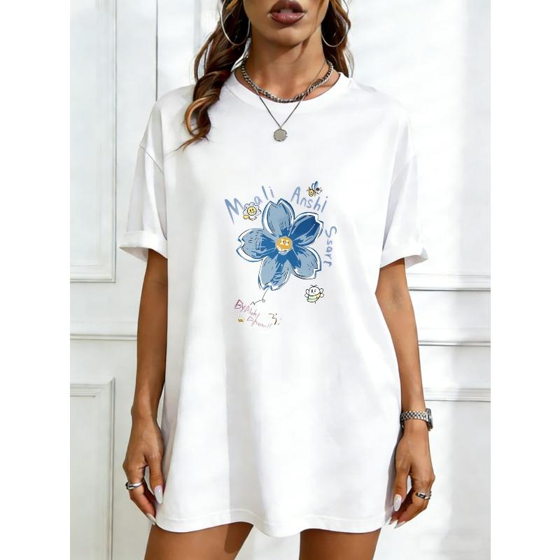 Oversized T Shirt Dress Black Blue Flower And Text Print Casual Streetwear For Women