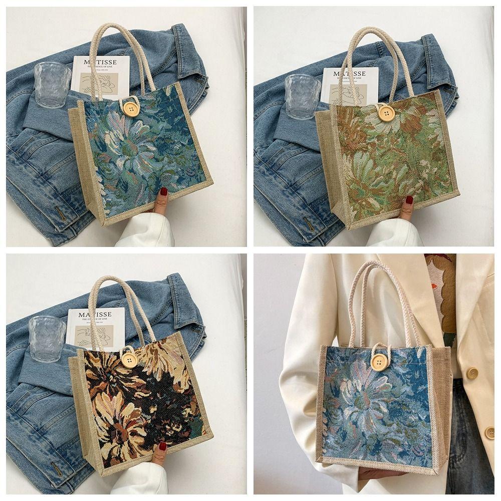 Large Capacity Linen Handbag Portable Printing Cloth Lunch Bag Ethnic Style Canvas Bag Travel