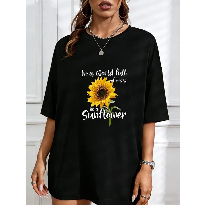 White Crew Neck T Shirt With Sunflower And Text Design For Casual Wear