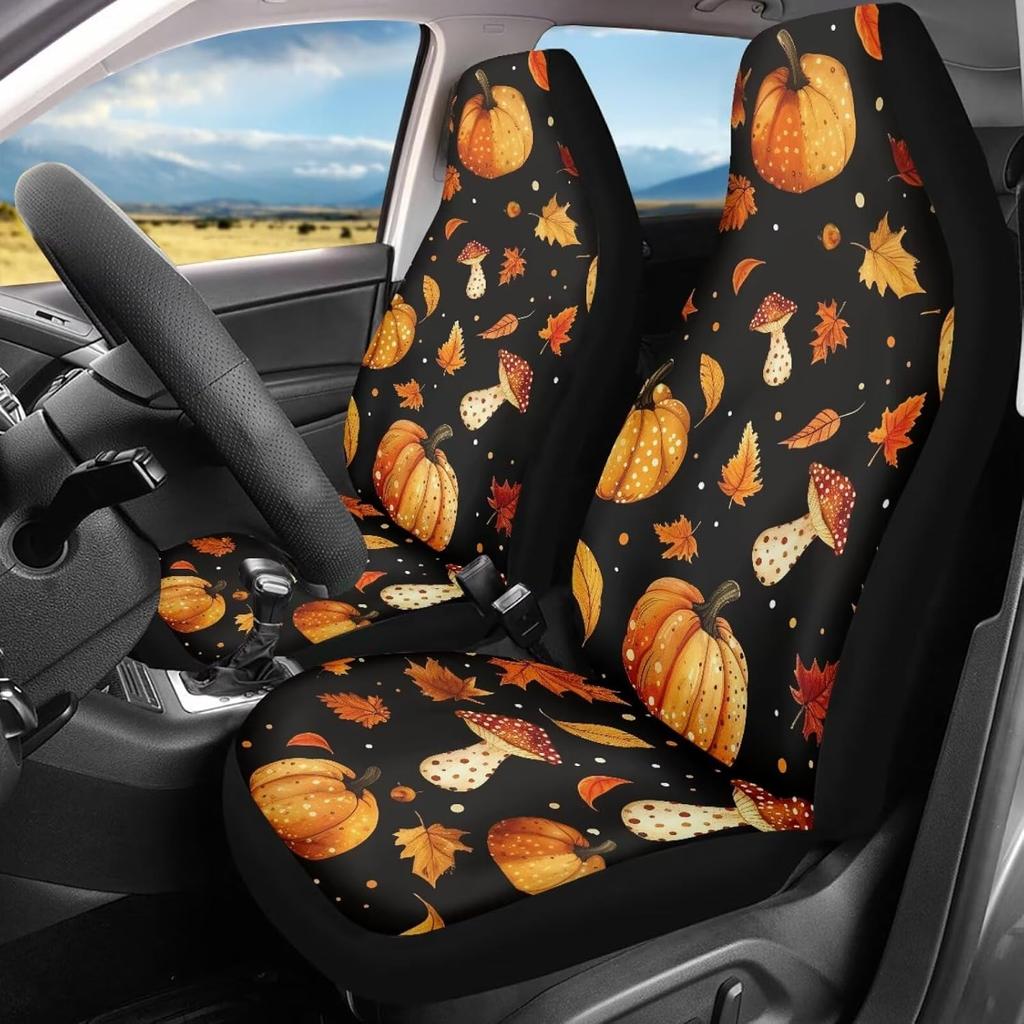 Pumpkin Mushroom Maple Leaf Front Car Seat Covers Protectors 2-Pc Set Graphic Print Auto Seat Covers For Holiday Car Decor