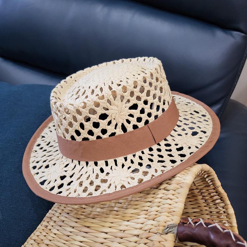 Japanese Korean Version Hollow Woven Beige Flat Top Top Top Hat Women'S Summer Sunshade Vacation Beach Straw Hat Small Fresh And Retro