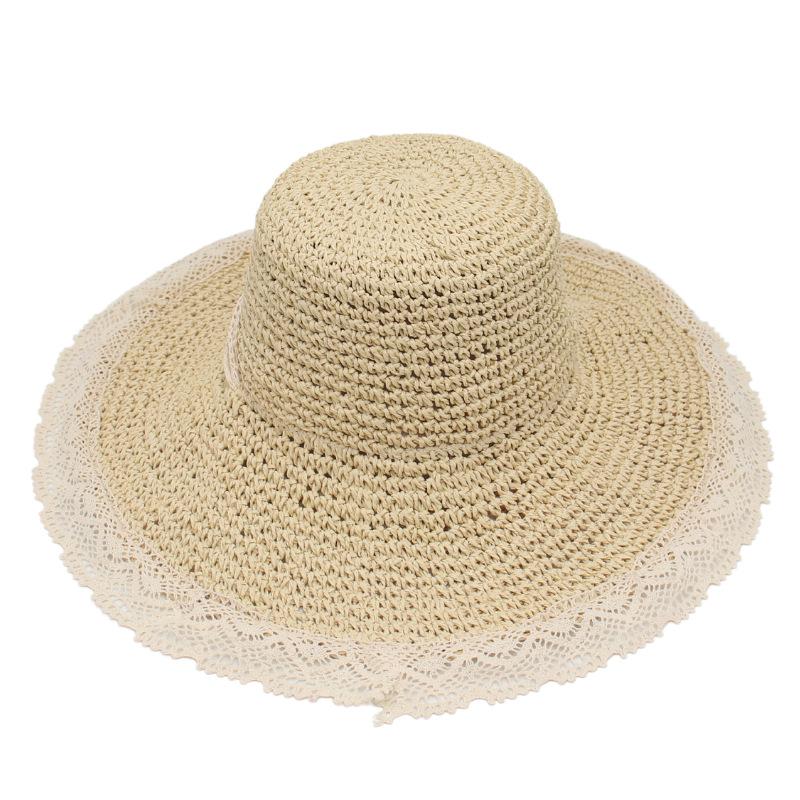 Large Brim Lace Straw Hat Women'S Sunshade Sunscreen Hat Foldable Windbreak Rope Light Casual Elegant Hat