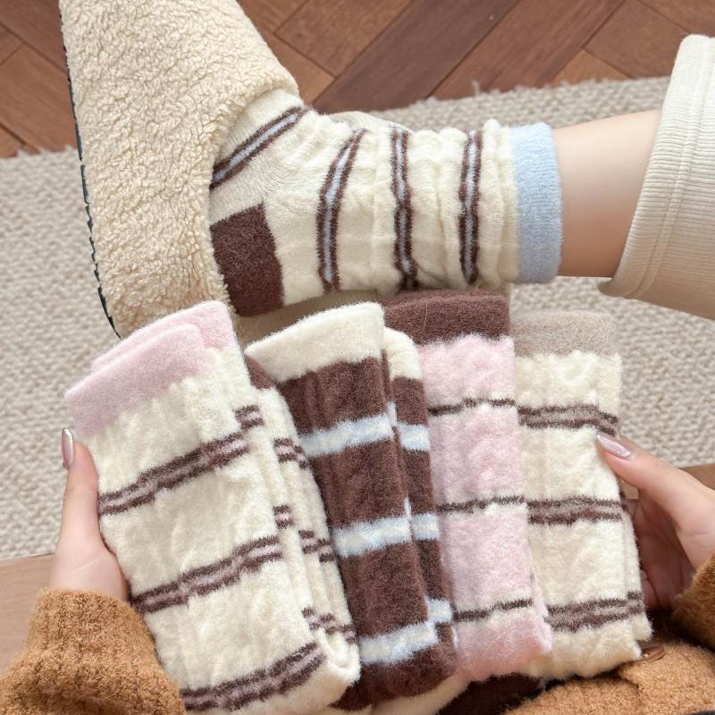Winter Thick Socks Striped Color Blocking Warm Plush Thickened Plush Striped Mid-Leg Socks Piled Up Sleep Socks At Home