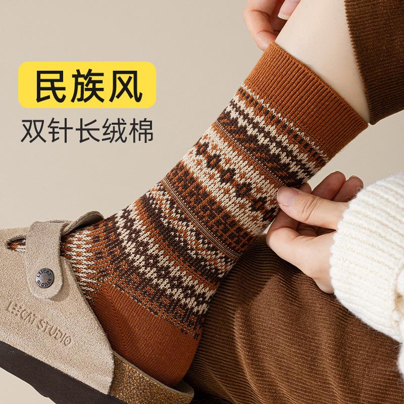 Ethnic Style Socks Women'S Season Double-Needle Cotton Socks Medium Tube Socks Warm Versatile Retro Trend Flower Socks