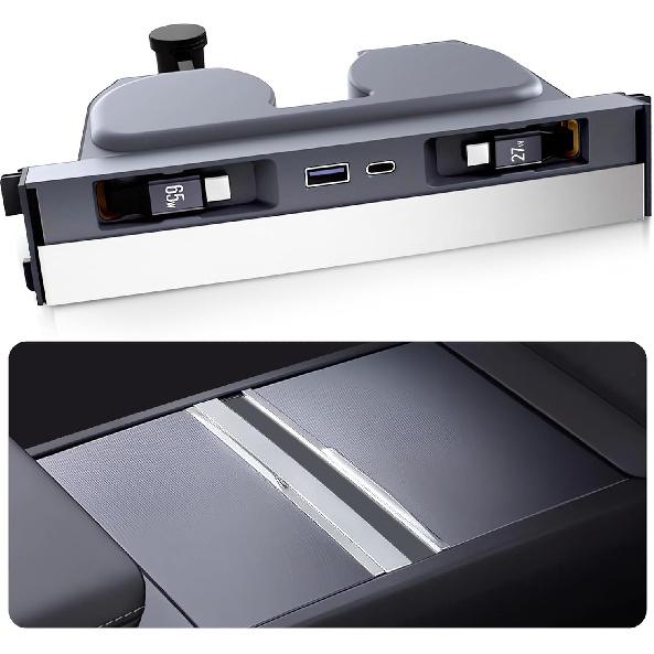 Waterproof Slide Cover Design: This charger hub comes with a sliding shield guard. Whenever the USB hub isn't in use, simply slide the cover to hide the charging ports. This not only prevents dust from entering the charging ports but also eliminates your worry about water damaging the ports if you accidentally tip over a cup. The sliding - cover setup plays a role in maintaining a cleaner car interior. Its modular design integrates with the interiors of Model 3 Highlander and Model Y Juniper