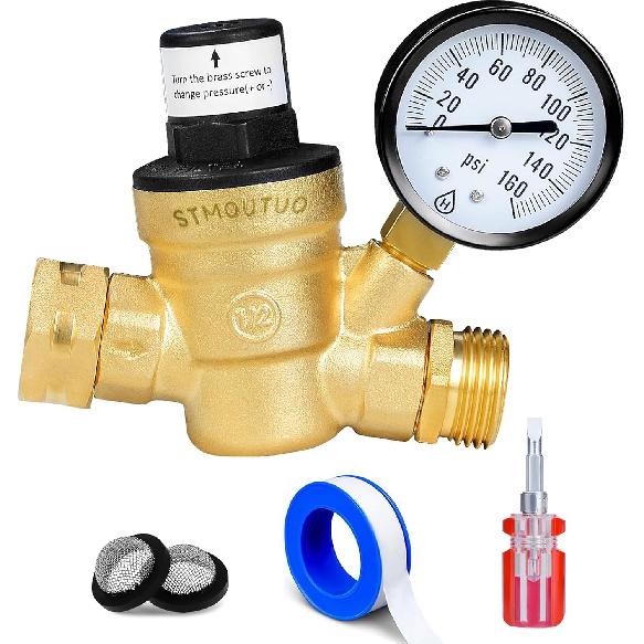 RV Water Pressure Regulator, Brass Lead-Free Adjustable Water Pressure Reducer With Pressure Gauge, Includes 2-In-1 Screwdriver, 2 Strainers, Raw