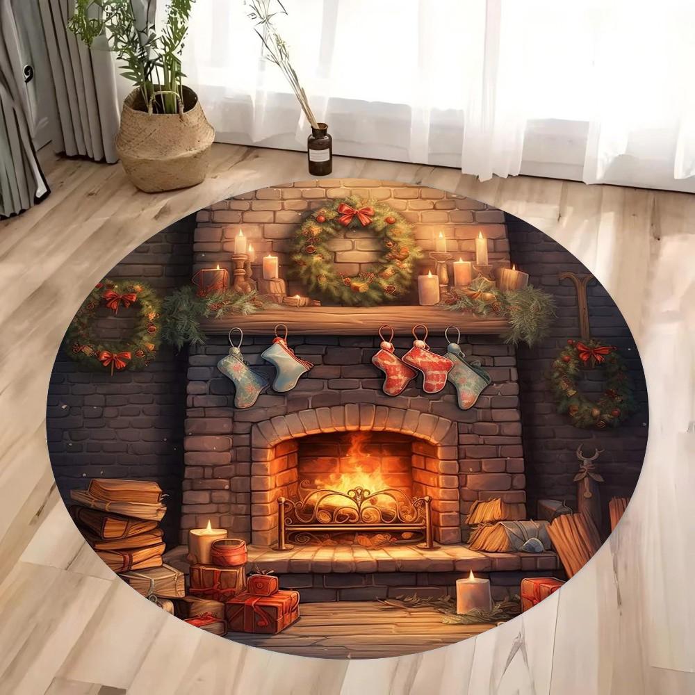Christmas Living Room Decoration Christmas · Retro Fireplace Round Carpet Bedroom Carpet Home Floor Mat Washable Leisure Carpet