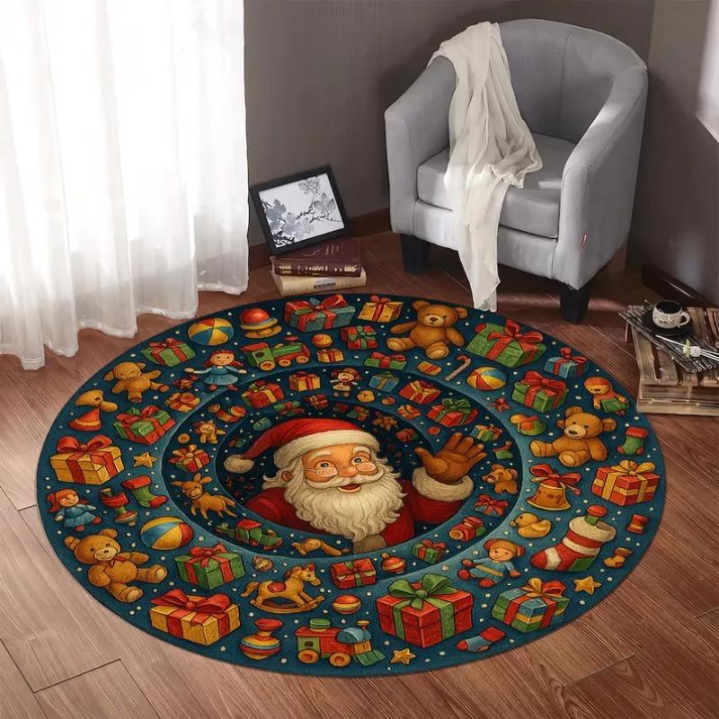 Santa Claus Toys Gifts Christmas Rug 3D Optical Illusion Round Carpet Festive Holiday Decor Santa Rug for Kids Room Winter Home