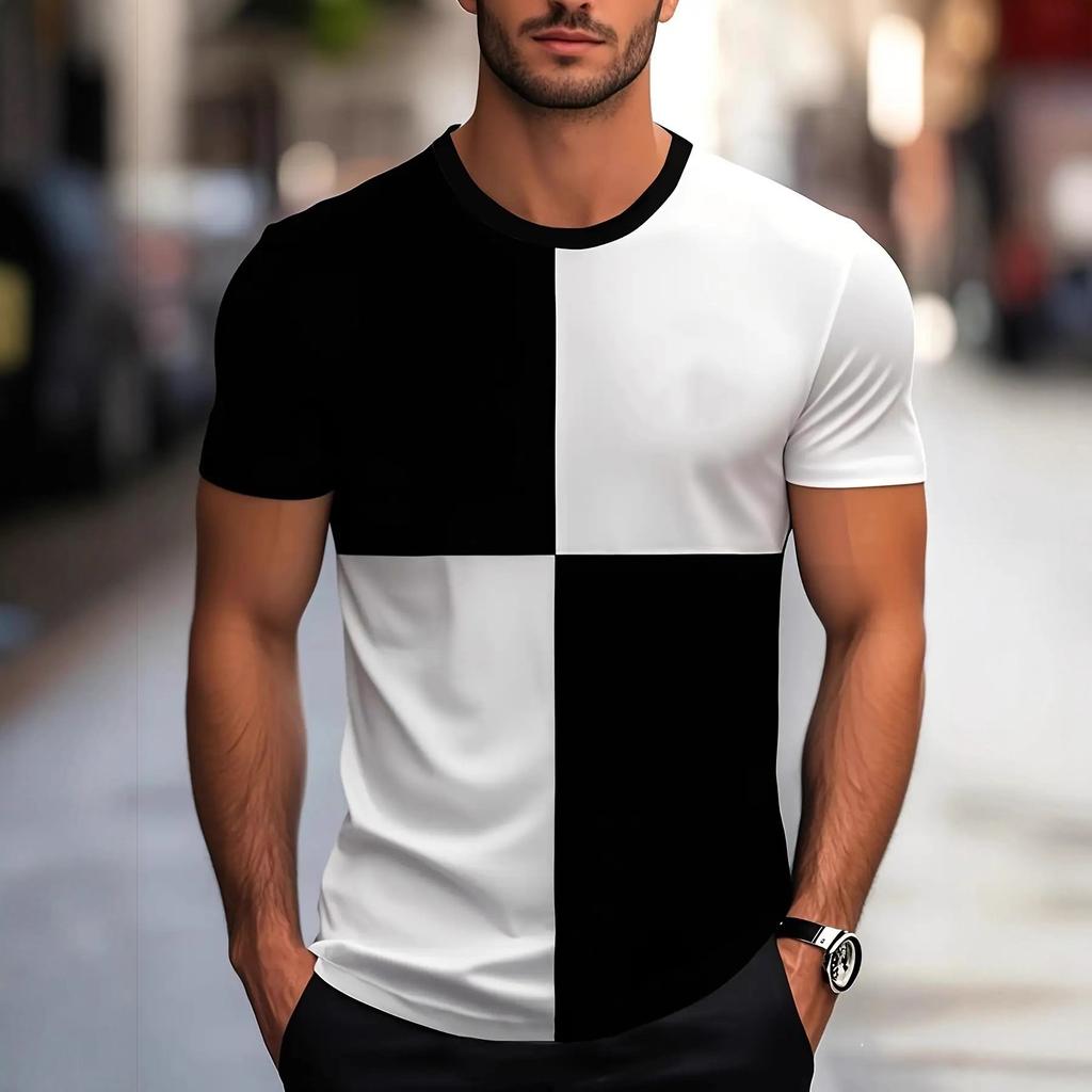 Men's new summer color blocked checkered round neck short sleeved shirt, trendy casual sports short sleeved shirt
