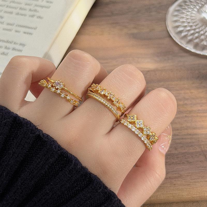Light Luxury Sweet Sister Four-Leaf Clover Full Of Diamonds, Row Of Diamonds, Zircon Double-Layer Open Ring, Niche High-End Sense Stacking