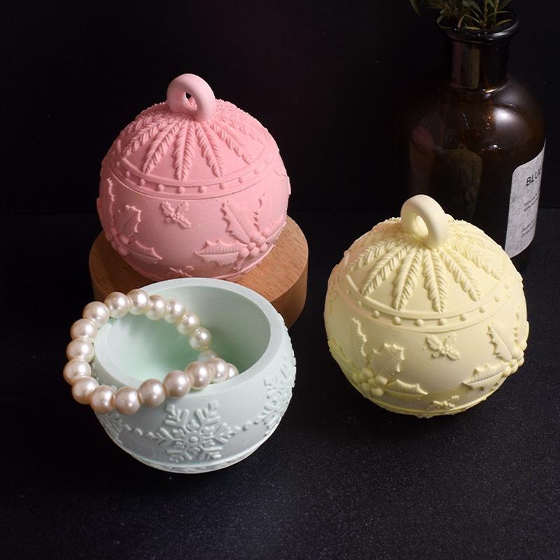 Christmas Round Ball Jar Silicone Mold With Lids DIY Handmade Concrete Relief Snows Berry Scented Candle Vessel Molds Xmas Decor