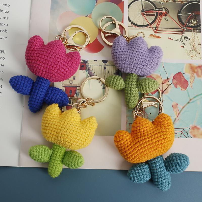 Crochet Tulip Keychain Handwoven Flower Key Ring Girl Backpack Pendant Creative Kintted Flower Gift
