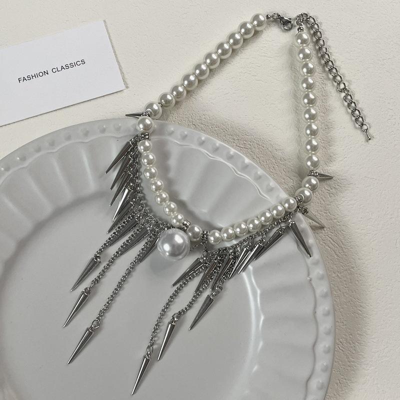 Light luxury niche personality rivet fringed pearl necklace female tide cool fashion temperament design advanced sense collarbone chain