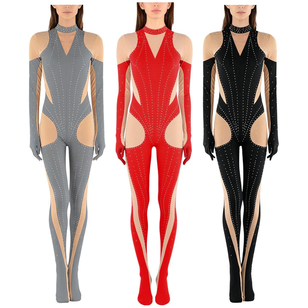 Unitard Lucios cu Strass-uri pentru Gimnastică Feminină, cu Mâneci Lungi și Mănuși, cu Picior, Culoare Contrastantă, Body pentru Patinaj Artistic
