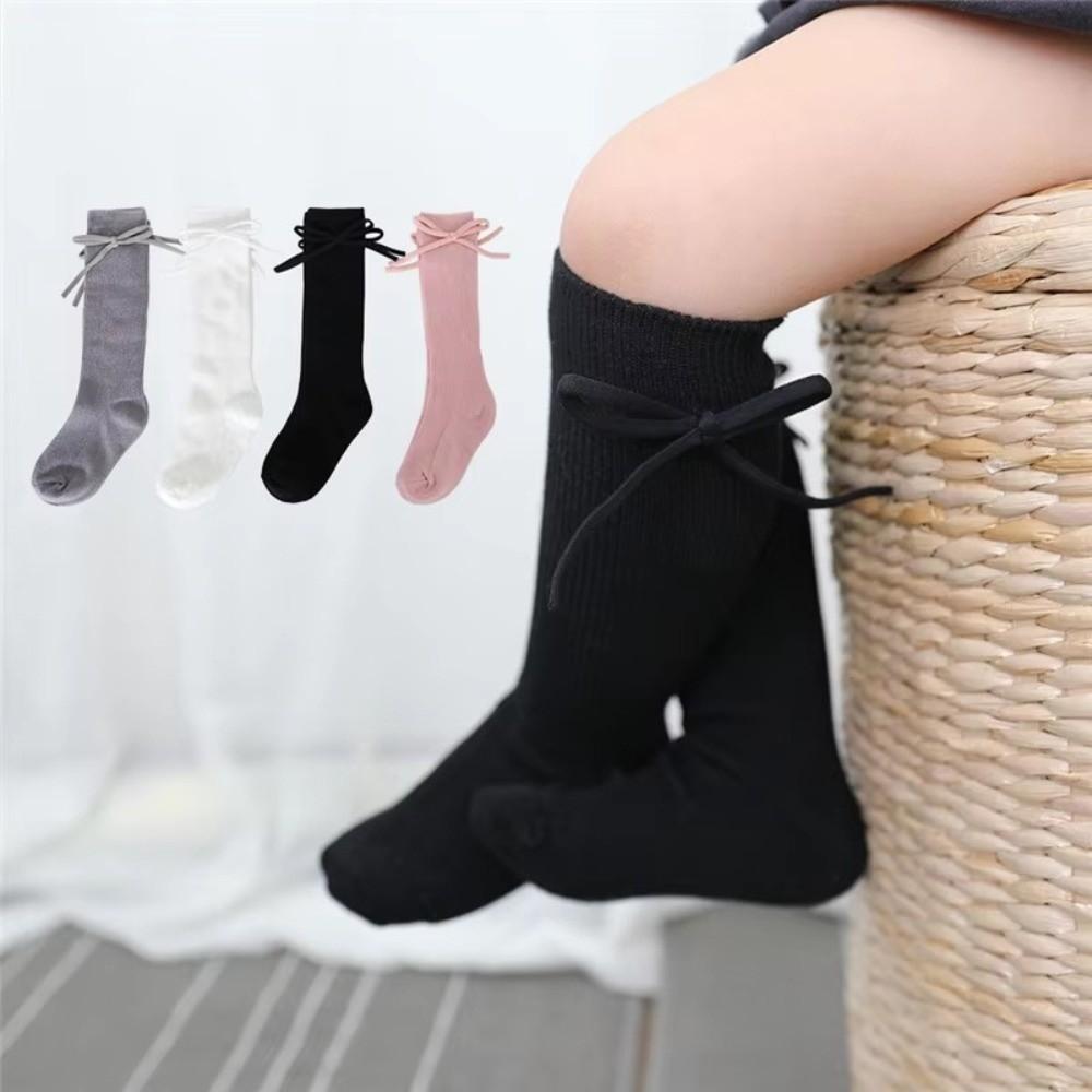 Cute Solid Color Kids Knee High Socks Cotton Bow Girls Bowknot Flat Long Sock Breathable Soft Children Princess Sockes