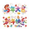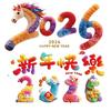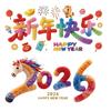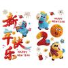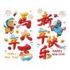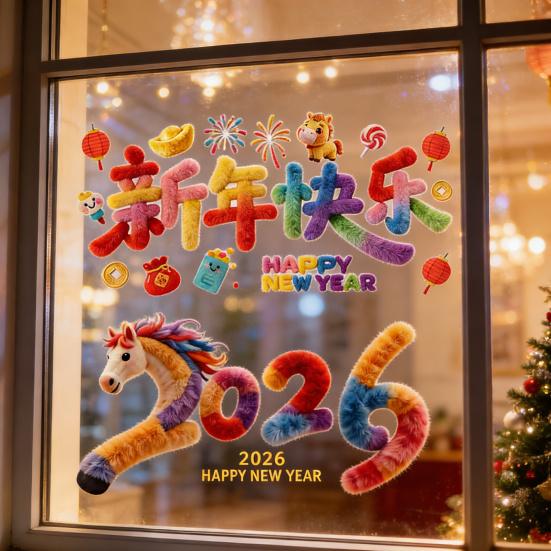 Celebrate the Lunar New Year with this vibrant new year window sticker, featuring bright red, yellow, and blue hues accented by pink stars and golden light effects for a striking visual impact. The plush texture adds warmth and a playful touch, while adorable anthropomorphic cartoon ponies dressed in scarves and bows bring lively expressions and joy to your space. Highlighting the "Year of the Horse" theme, the sticker uses three-dimensional plush fonts and festive gradient colors to convey auspiciousness.