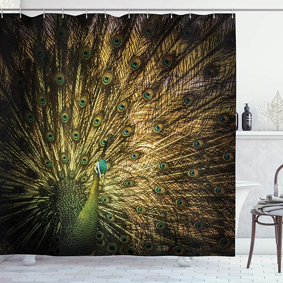 majestic male peacock shower curtain, dark hued feather art, modern print, fabric bathroom decor
