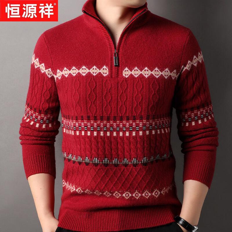 Hengyuanxiang Men's Thickened 100% Pure Wool Half-Zip Pullover Sweater