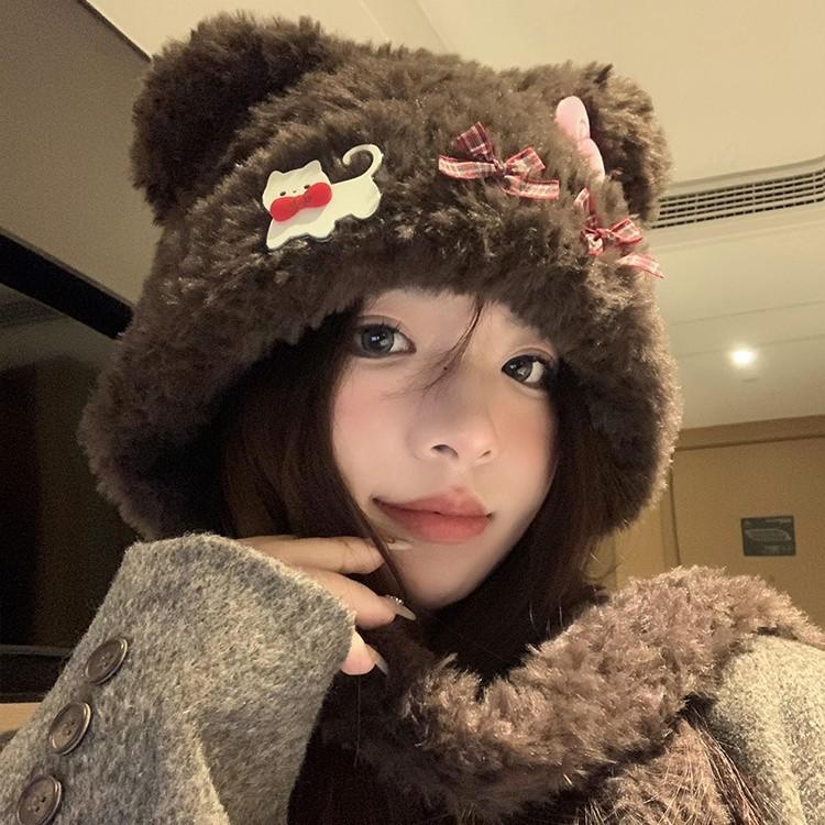 Cute bear ears cat bow plush hat female thickened warm face small hat Lei Feng hat