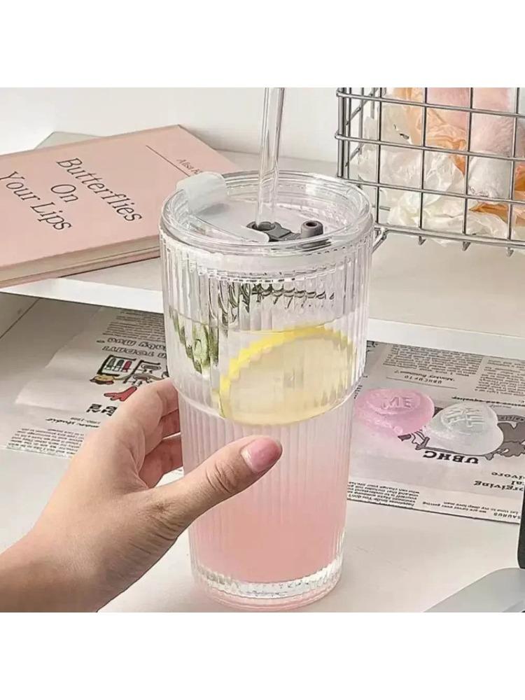 600ML Stripe Glass Coffee Cup with Straw Lid For Milk Tea Juice Breakfast Mugs Drinkware Travel Drinking Water Bottle Home Bar