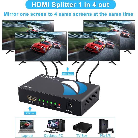 【HDMI Splitter 1 In 4 Out】1x4 HDMI splitter distributes audio and video signal from a single source to 4 HDMI displays simultaneously,present you high quality video/audio without lag, flash, drop in resolution.(NOT switch, 4 displays will show the same picture)