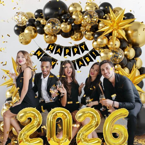 Celebrate the arrival of 2026 with this easy-to-assemble new year balloon decoration set, perfect for adding a festive touch to your party. Crafted from high-quality latex, these Happy New Year 2026 balloons maintain their shape and can be reused for future celebrations. The package includes all essential 2026 New Year party supplies, designed to meet your decoration needs and create an unforgettable atmosphere.