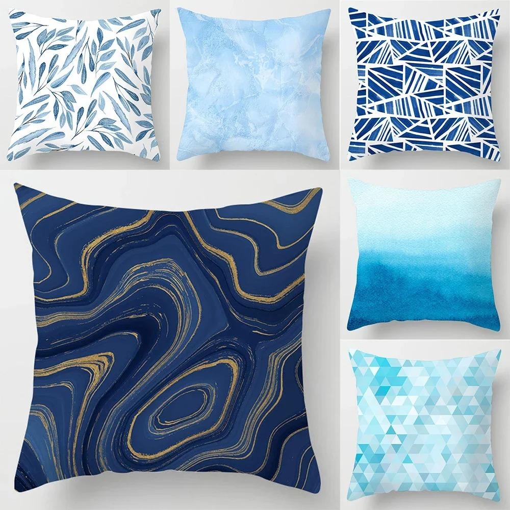 Home Decor Blue Geometric & Leaf Pattern Throw Pillow Covers Pattern Cushion Cover Suitable for Sofa Bedroom Car Pillow Cover