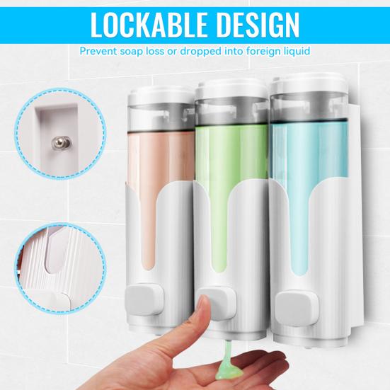Maximizați spațiul din baia sau bucătăria dumneavoastră cu acest dozator de săpun montat pe perete, proiectat pentru o organizare eficientă și o viață fără dezordine.. Perfect pentru spații compacte, depozitează trei lichide - șampon, balsam și gel de duș - simplificând elementele esențiale pentru duș într-o singură unitate elegantă.