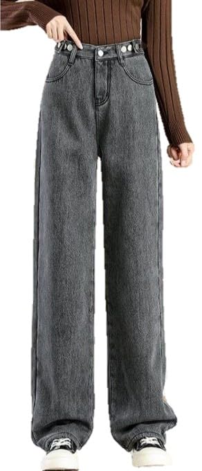 Bobo Hanhan Denim Pants with Fleece Adjustable and Perfect for Fall and Winter & Women's Wide-Leg Lining, Waist, High-Waisted Pants, Leg-Shaping,