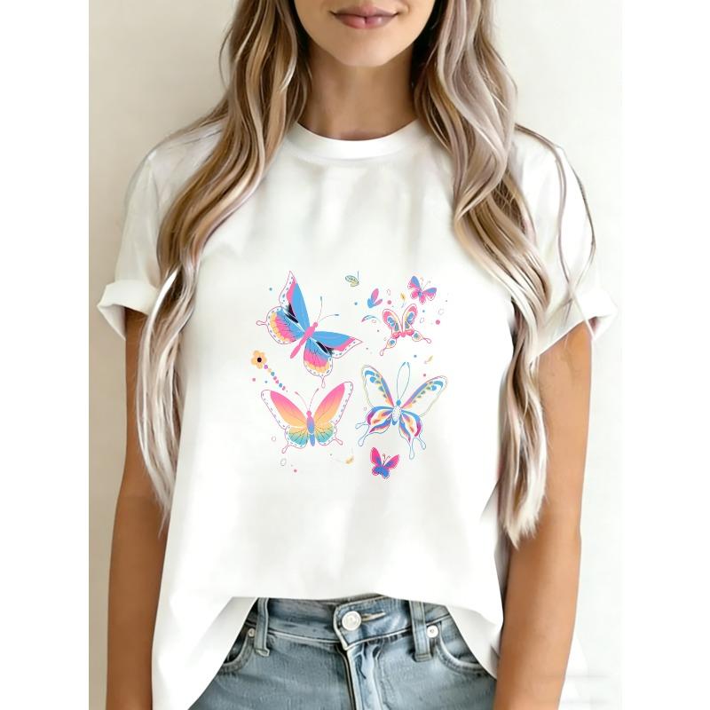 Butterfly Print T Shirt White Colorful Butterflies And Flowers Design Casual Summer Wear