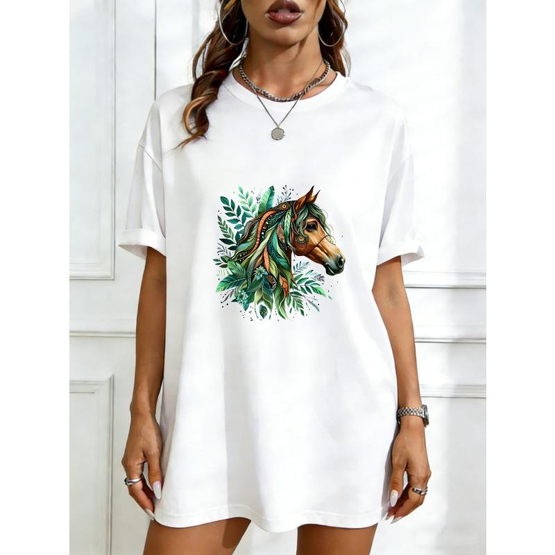 Oversized T Shirt Dress Black Horse With Tropical Leaves And Flowers Print Casual Wear For Women