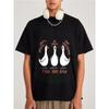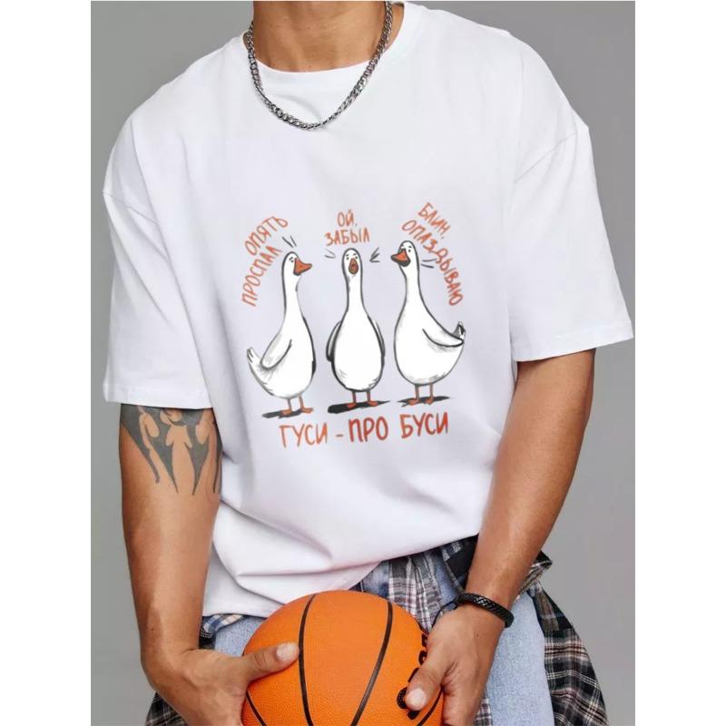 Crewneck T Shirt White Goose Cartoon Print with Russian Text for Casual Wear