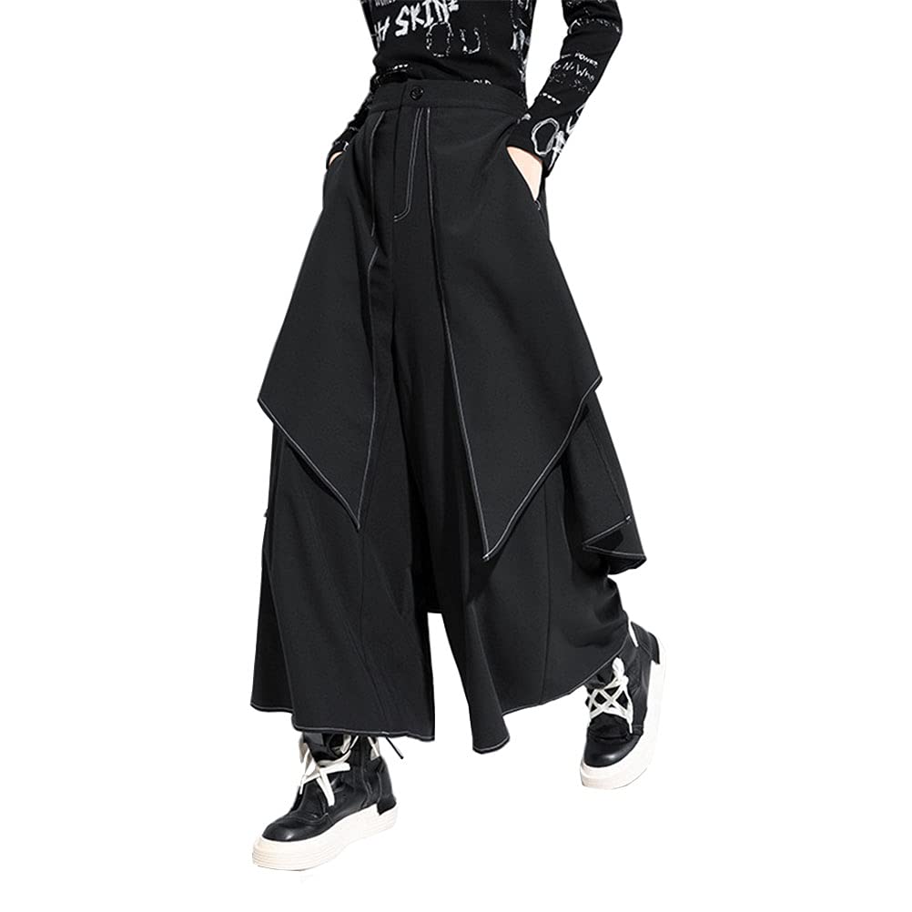 These wide-leg pants feature a modern and stylish gothic design. The contrast stitching creates a unique look. The layered construction creates a three-dimensional silhouette, setting them apart from regular pants with a sophisticated design. The black base with white stitching adds a stylish accent, expanding styling options. The button closure and drawstring at the waist ensure a comfortable fit. The pockets add practicality. Perfect for street fashion and modern styles, these pants are recommended for those who enjoy a unique style. They're a statement piece for everyday wear as well as special events. The unique design features a skirt layered over wide-leg pants. The back waist is elastic for a comfortable fit. Perfect for a smart, casual look!