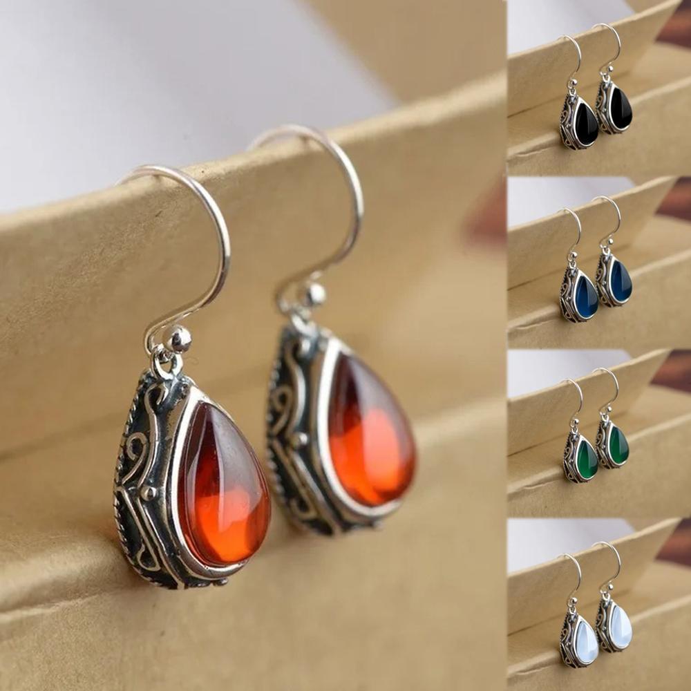Vintage Waterdrop Red/Blue/Green CZ Stone Dangle Earrings for Women, Temperament Elegant Lady Drop Earrings Wedding Band Jewelry