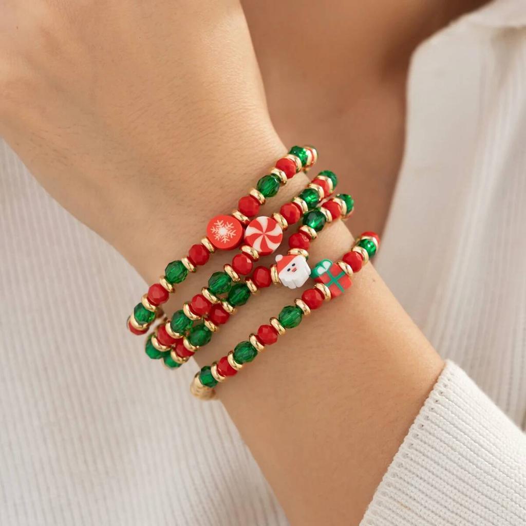 KunJoe 4Pcs/Set Red Green Crystal Bead Chain Bracelet Women Cute Snowflake Snowman Elasticity Charm Bracelets Christmas Jewelry