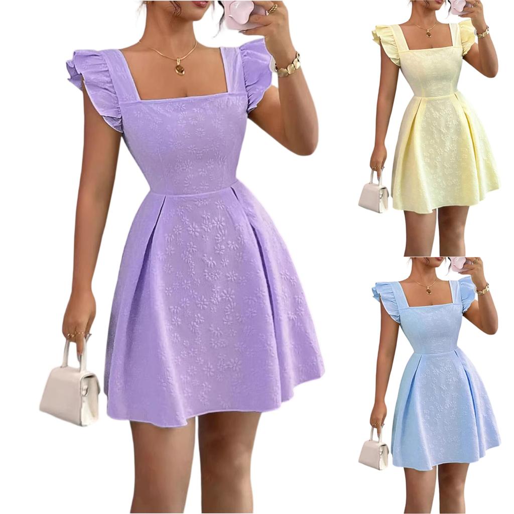 Women's Fashionable Color Square Collar Pullover Fresh Sweet Short Skirt With Waist Cinched A-line Dress