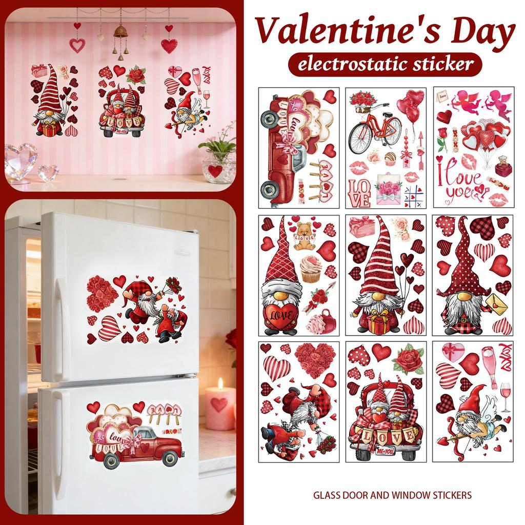 Valentine's Day Window Clings Decoration Heart Stickers Love Day Window Decals 9 Sheets Window Clings For Valentine's Day Wedding Party Decorations Description: Valentine's Day and wedding party art decorative supplies. These stickers will decor glass-, wall, cabinet doors, mirror, refrigerators, balloons, and other smooth things A variety of stickers with different patterns, flowers, hearts, dwarfs, cars, balloons, champagne, wine glasses, cakes, envelopes, angels, gifts and more. Enough quantity for your DIY home 9 Sheets window decals, each measures 7.87inch * 11.81inch to meet your needs for party decorations. Eco-friendly material suitable for any adults and lovers to decorate the living room, bedroom, kitchen, etc. These love-ly valentines day gnome window decals are thin plastic static clings. No glue, spray a little water the surface before stick it window, water will make them stick better. Easy to keep shape and no residue remained when peeling off from win-dows PVC material, two-sided design so you can see the pattern from both sides of the window. Can stick smooth objects, such as glass, mirrors, tiles, wood, iron and other smooth objects. Reusable, water-proof and Specification: Material:pvc Note: There might be 2-3cm errors of dimension data due to manual measurement. There might be slightly color difference due to different light and monitor effect. Package includes: 9 stickers