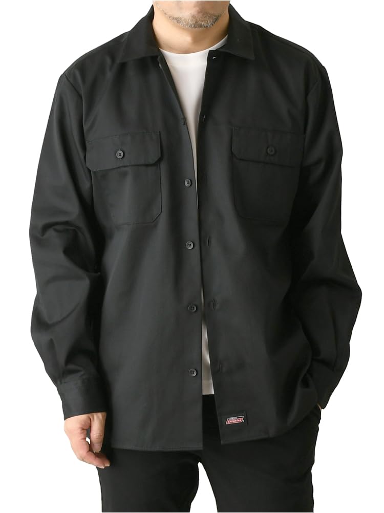 Genuine Dickies Men's TC Twill Work Shirt, Hickory Stripe, Solid Color, I4-1399, Size L, A-Black