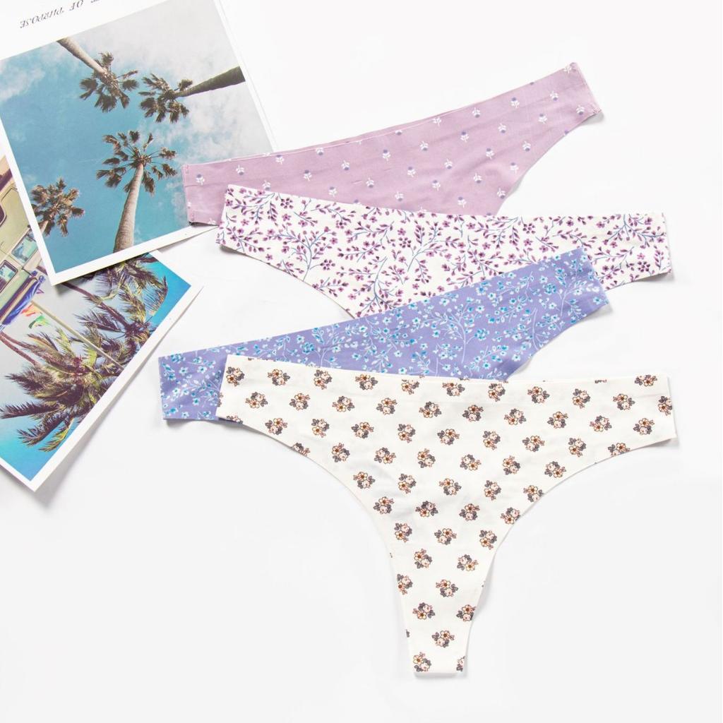 Female Spring and Summer Offset Printing Flower Breathable Fast Dry Low Waist Ice Silk Non-mark Thong Underwear