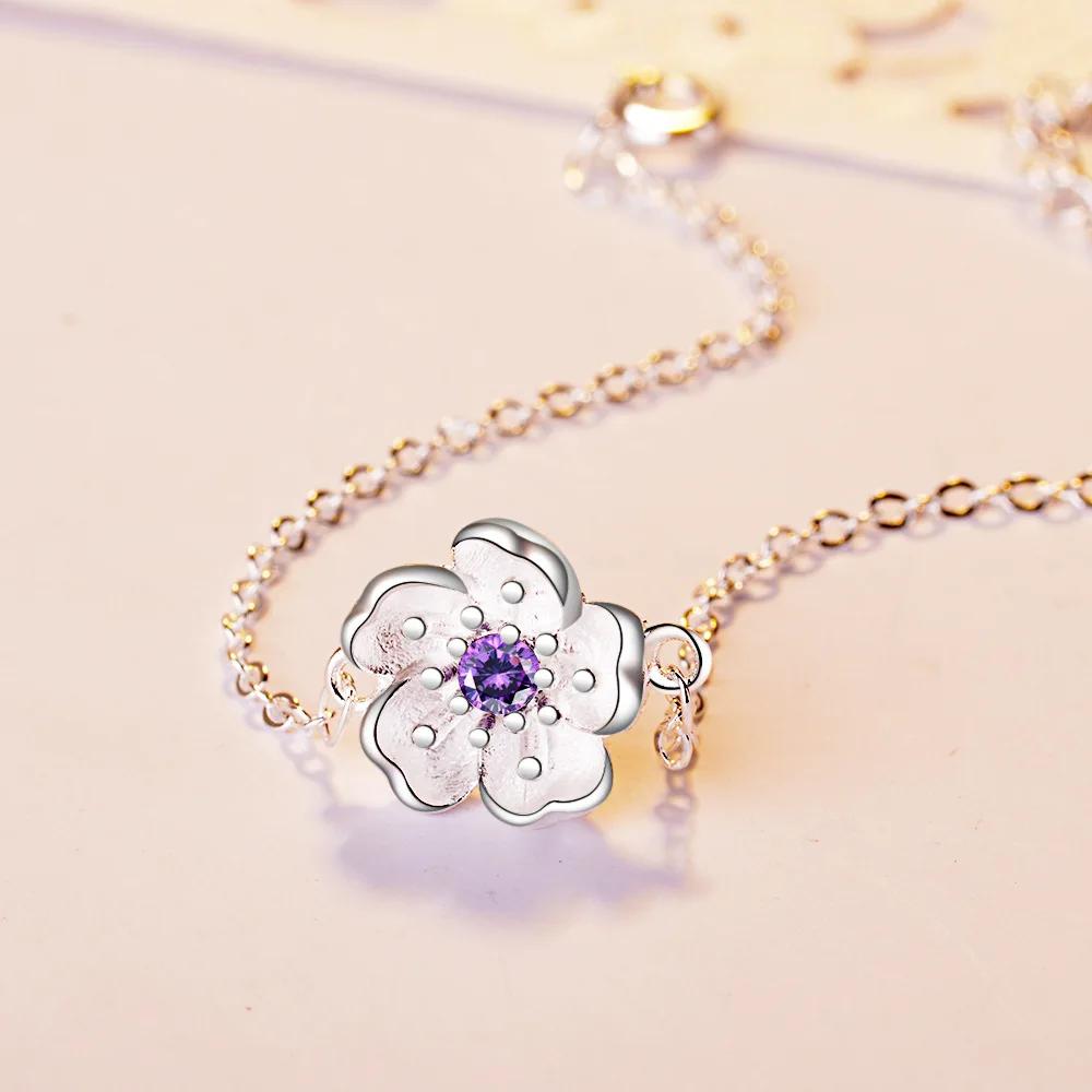 New Arrival Silver Color Pink/Purple Cherry Blossom Flower Zircon Bracelet for Women Pulseira Feminina Gift