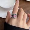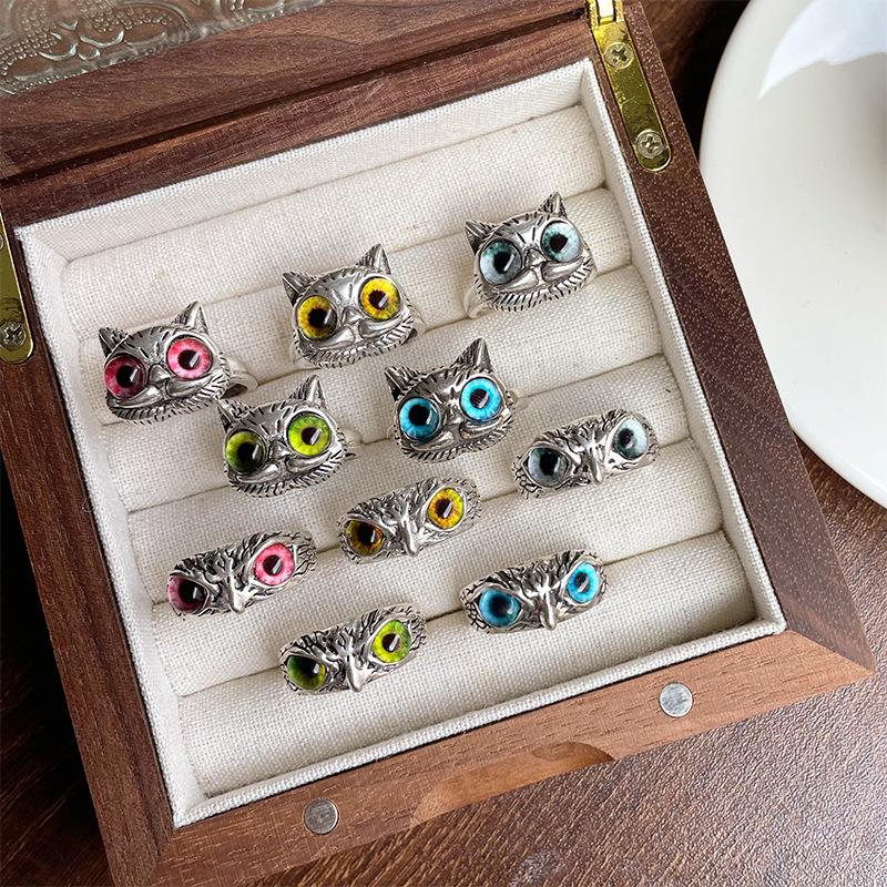 Cute Retro Thai Silver Cat Rings Fashion Cat Owl Eye Opening Adjustable Ring for Women Men Trendy Statement Accessories